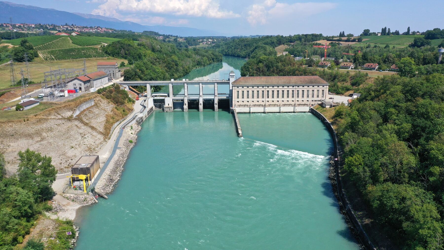 En 1924, s’achèvent cinq ans de travaux colossaux pour construire le barrage de Chancy-Pougny, sur le Rhône, à la frontière franco-suisse. D’une hauteur de 29 mètres, d’une longueur de 115 mètres, sa chute d’eau est de 11 mètres. Au départ, il est équipé de cinq turbines de type « Francis » et produit 200 GWh d’électricité par an. Les investisseurs français, majoritaires à l’époque, destinent l’électricité produite aux usines métallurgiques françaises du Creusot, alors en plein essor.
